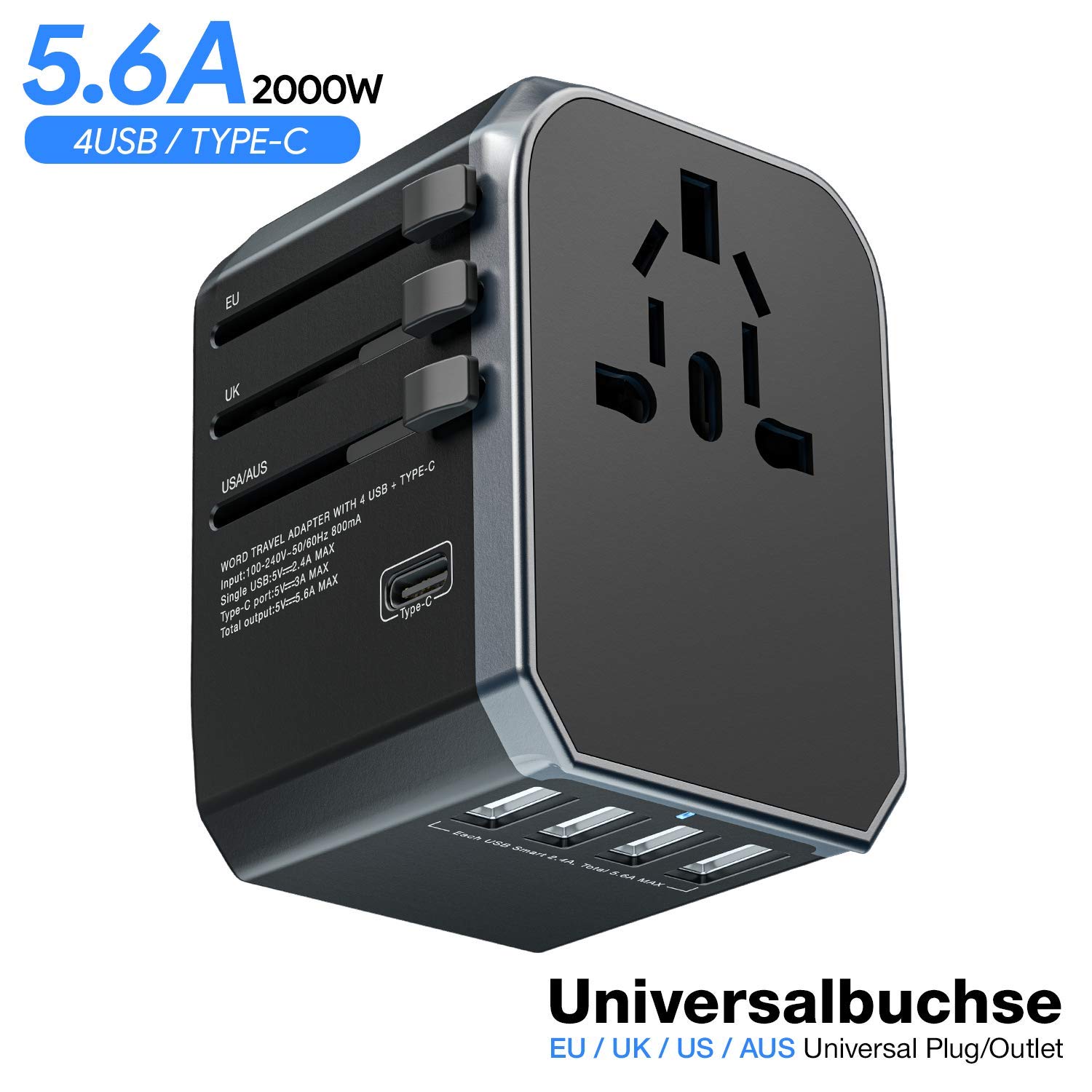 MUSCCCM Adaptateur de Voyage, Adaptateur Universel Prises Internationale avec 4 USB Type C double fusible pour UE/US/UK/AUS Utilisé dans Plus de 150 Pays